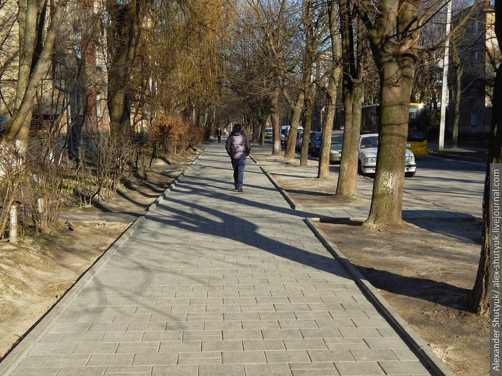 27. В напрямі від центру по тротуару йде велодоріжка. Не було можливості зробити ще одну велосмугу, тому тепер велосипедисти і пішоходи повинні знаходити спільну мову. Досить швидко велодоріжку захистили від паркування стовпцями.
